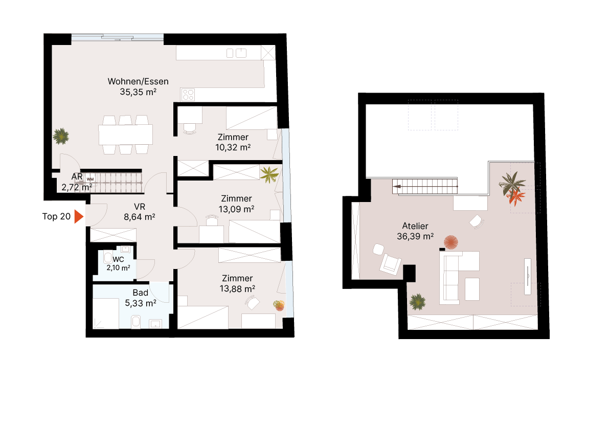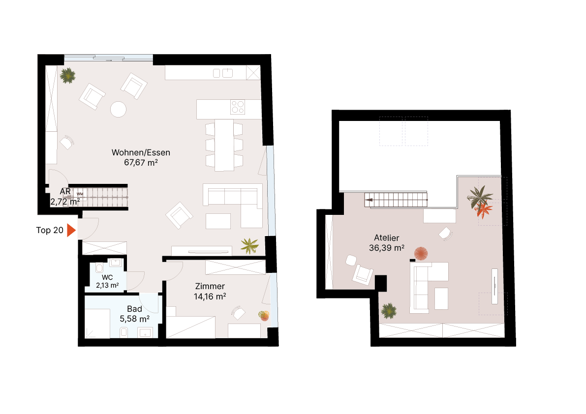 Klare Raumaufteilung, viel Gestaltungsspielraum, lichtdurchflutete Räume und eine großzügiges Atelier: Der Grundriss überzeugt durch maximale Wohnqualität und Funktionalität.